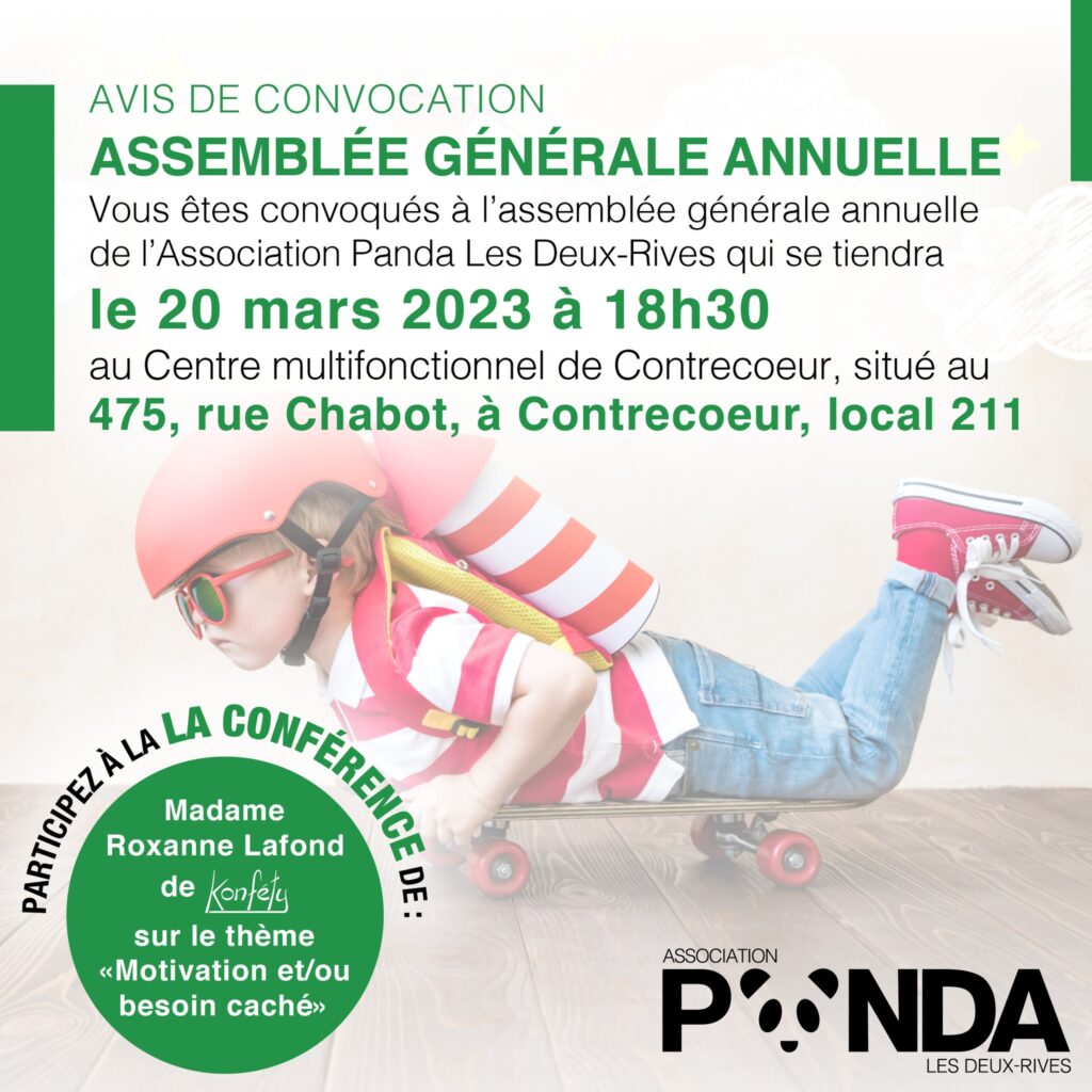 Motivation et/ou besoin Adresse: 475 rue Chabot, Contrecoeur local 211 Date: Lundi le 20 mars 2023 Horaire: 19:00 PM – 20:00 PM EST Organisme: Panda Les Deux-Rives Pour s'inscrire: pandalesdeuxrives@gmail.com PARTAGER: